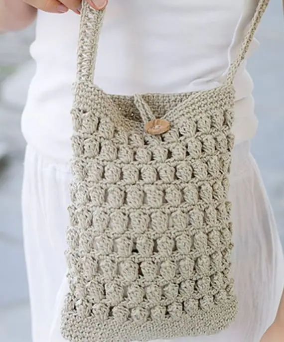 This crochet bag is compact yet surprisingly roomy. The sturdy bottom and top give it shape, while the body is made from airy granny stitches. A button-and-loop closure keeps it secure. It’s a great mix of structure and softness, ideal for daily essentials.