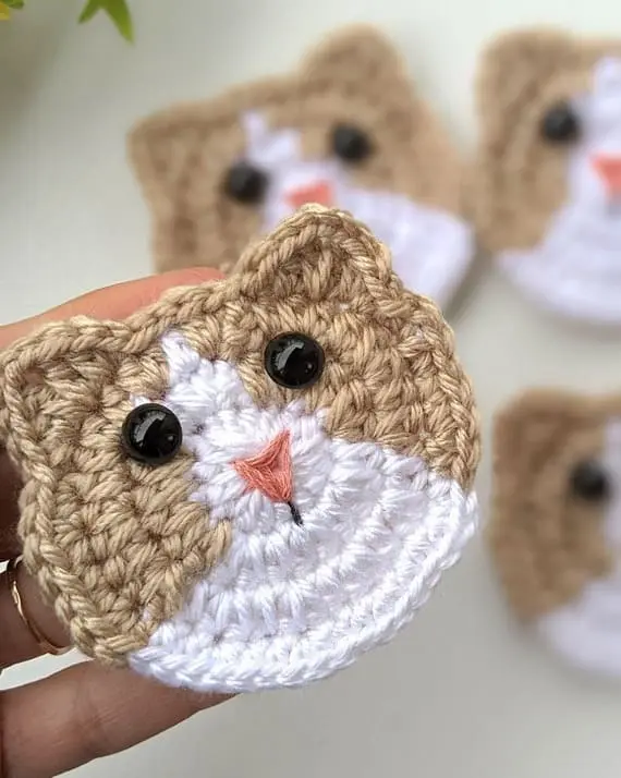 This crochet kitty face applique is pure crochet cuteness. The base is soft white, with beige and brown cheeks that melt into the ears, plus a tiny pink nose and shiny bead eyes. Whether you sew it onto a scarf, pouch, or baby blanket, it’s guaranteed to melt hearts wherever it goes.