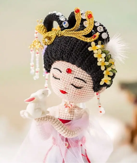 This peaceful crochet doll has a serene expression and a refined look. Her hair is styled in an elegant updo inspired by traditional Chinese design. Delicate and detailed, she’s a meditative project for experienced crafters who enjoy creating expressive characters.