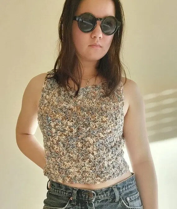 Bold and beautifully structured, this crochet tank top features diagonal and straight straps that form an eye-catching open-back design. The unique layout draws attention to your shoulders and adds a daring twist to any outfit – it’s a piece that’s both elegant and confident.