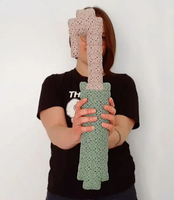 Ever seen a pillow that looks like a pixelated sculpture? This pixel-crochet cushion, made of tiny colorful granny squares, forms a bold geometric silhouette that resembles a retro weapon or symbol. Its unique structure makes it a great accent for modern interiors or gamer-themed rooms.