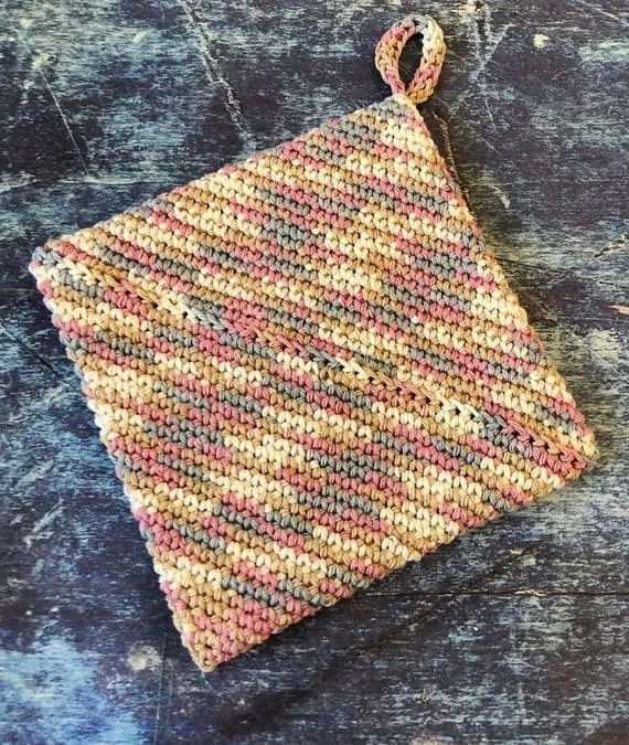 This double-thick crochet square potholder is made to be used and loved. Soft yet durable, with a sweet loop in one corner and playful multi-colored yarn, it quickly becomes an essential part of the kitchen. Layered construction keeps it sturdy while adding visual charm to the room. PHOTOS by Crystal Marin / Ravelry.com Find the original pattern on christacodesign.com, or read more about it on