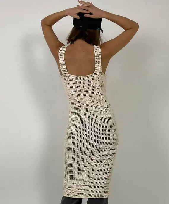 This crochet robe combines minimalist design with striking detail. Made with a tightly woven net-like structure, the dress showcases large, beautiful flowers that create a visual masterpiece. The broad straps add comfort and style, while the intricate floral motifs make the dress an eye-catching piece for any occasion. PHOTOS by Caroline Edal / Ravelry.com Find the original pattern on hobbii.com,