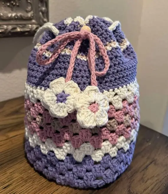 A playful mix of textures gives this crochet striped drawstring bag its unique charm. Rows of granny stitch alternate with classic crochet to create bands of varied width and character. It’s both nostalgic and modern, with soft color changes and adorable floral motifs tied at the ends of the drawstrings – a lovely detail that adds a gentle, handmade whimsy. PHOTOS by Mateera Kaikko / Ravelry.com