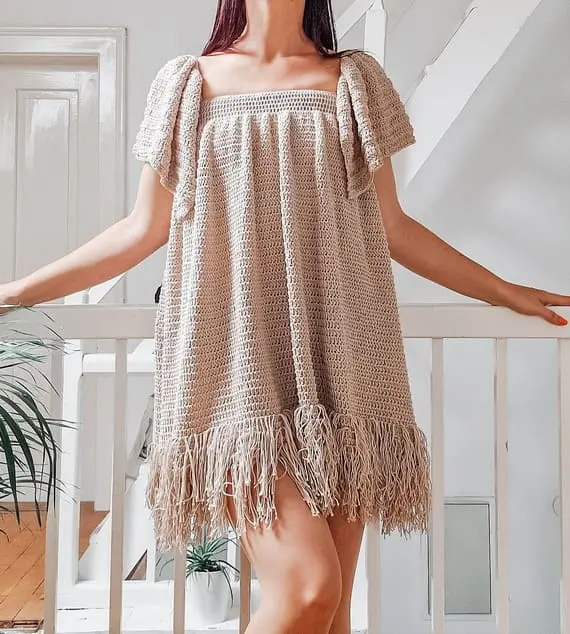 If you love volume and drama, this crochet dress is your dream come true. Designed with oversized ruffles, short puffy sleeves, and a bold front panel, it flows into a flared skirt ending in layers of playful fringe. Every detail says summer celebration – perfect for beach photos, parties, or just feeling fabulous. PHOTOS by Karmen Režek / Ravelry.com Find the video tutorial on YouTube, or read