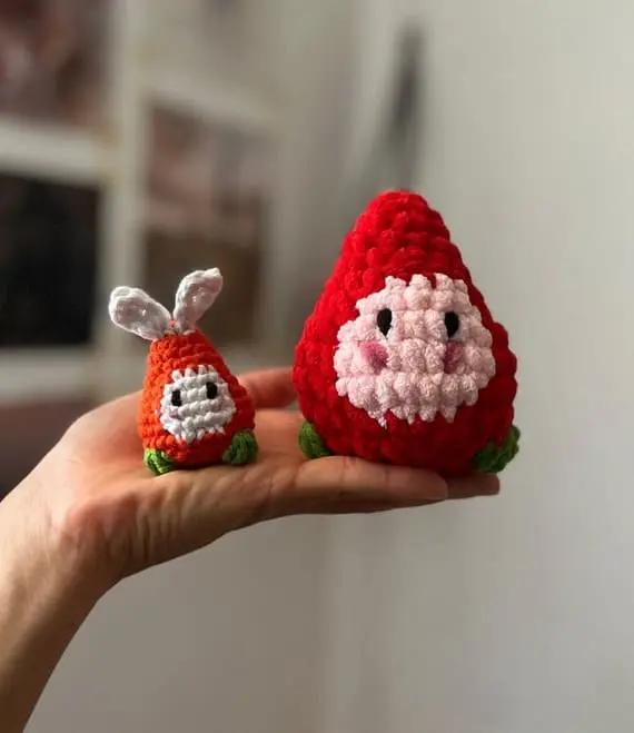 This crochet strawberry is full of whimsy! With a cheeky smile and the option to add tiny ears and a tail, it magically turns into a bunny-berry. Great for keychains, toys, or cheerful shelf decor, it’s a playful way to add personality to your crafts. Hook your own little berry friend today! PHOTOS by 2707crochettes / Ravelry.com Find the original pattern on Ravelry.