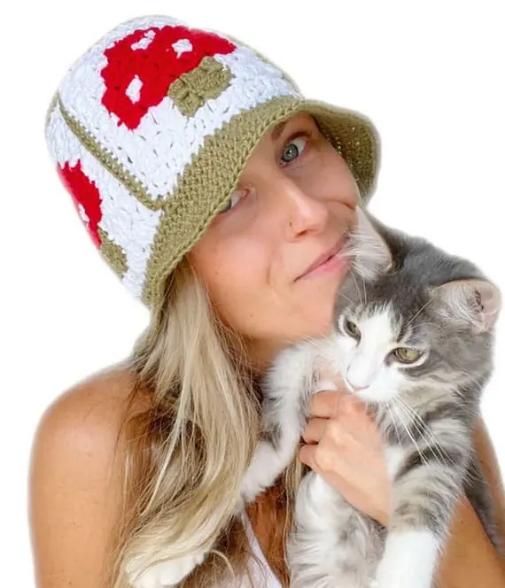 This crochet summer bucket hat comes with a twist – it’s covered in mushrooms! Red caps with white dots peek out from the crown, giving it that playful forest-core feel. Light, fun, and perfect for festivals, parks, or just showing off your crochet skills with magical, earthy whimsy. PHOTOS by Melissa Hassler / Ravelry.com Find the original pattern on lovableloops.com, or read more about it on