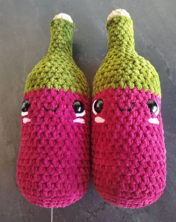 This plush crochet wine bottle is a soft and quirky take on your favorite evening drink. Made from velvety yarn, its rosy body contrasts with a green bottle neck and is finished with embroidered cheeks, eyes, and a kind smile. The detail of it being “half-sipped” adds humor and charm. Place it on a shelf or gift it to a wine-loving friend – it’s a delightful accent full of personality. PHOTOS by