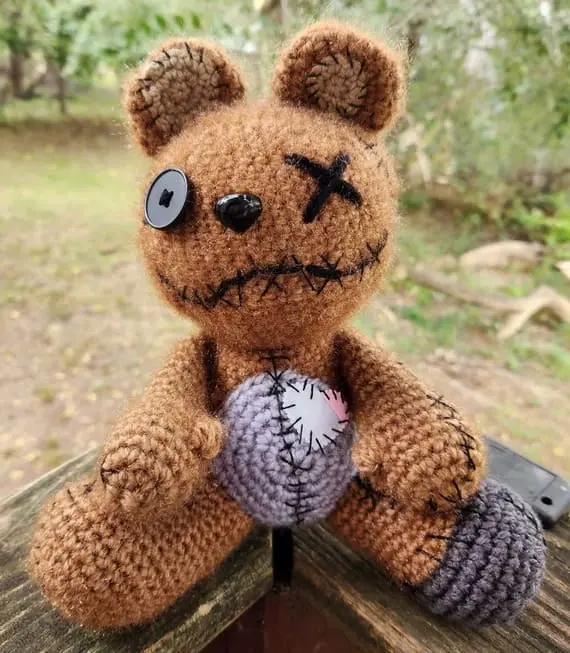 This crocheted bear looks like it escaped from a spooky lab. With a stitched mouth, patched belly, one button eye and one X-shaped scar, it’s like a Frankenstein-style zombie bear. Weird, brown, and oddly charming, it’s perfect for those who love creepy-cute projects. PHOTOS by StringsandThingsByJoyce / Ravelry.com Find the original pattern on Ravelry.