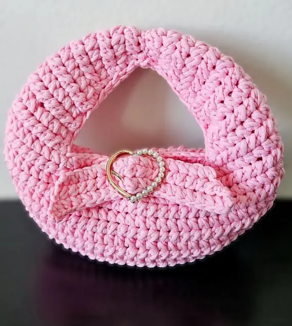 Imagine a crochet bag that’s both adorable and eye-catching – this crochet design has a round silhouette thanks to its thick, cushioned handles. The main body forms a half-circle, beautifully finished with a tiny bow and a heart-shaped brooch. Mix and match yarn colors for your own custom accessory full of personality. PHOTOS by Raine Eimre / Ravelry.com Find the original pattern on
