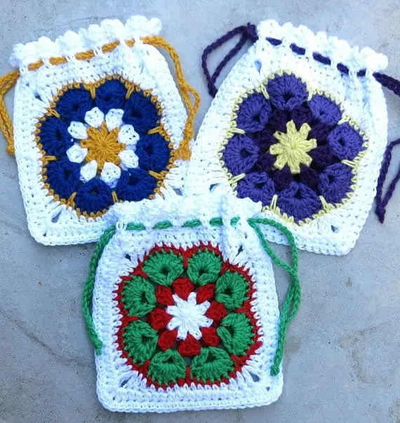 Looking for a cute storage solution or a tiny statement bag? This small crochet drawstring pouch is made from two squares, each featuring a stunning floral motif in the center. You can adjust the size and colors easily. Hang it on a bigger bag as an add-on or use it to hold all your little treasures. PHOTOS by Lynne Samaan / Ravelry.com Find the original pattern on d60crochet.com, or read more