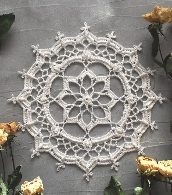 A delicate crocheted doily, with airy lacework and a flower at its heart, brings an elegant touch to any table. The intricate lace that circles the design creates a light and refined feel, perfect for brightening up your home. Its charm adds beauty to your decor, drawing attention while remaining subtle. PHOTOS by Machika Sawada / Ravelry.com Find the original pattern on Ravelry.