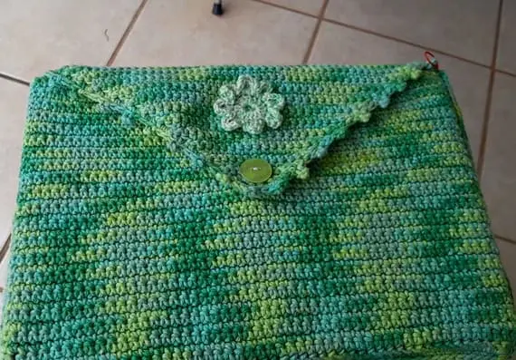 Create a statement with this rectangular crochet clutch in earthy green tones. The multicolored yarn adds depth and a unique woven effect. Designed like an envelope with a button closure, it’s easy to customize with flower appliques or playful trims.