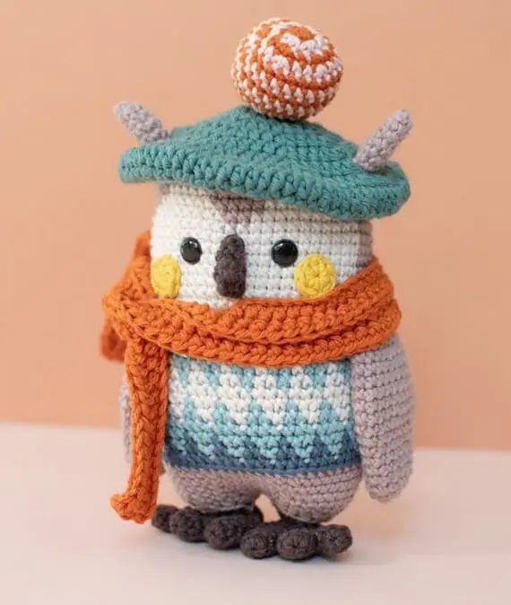 This crochet owl is not just wise but seriously fashionable. Dressed in a cozy sweater, chunky scarf and a hat with a giant pompom, she’s ready for the runway. Her ears poke out through the hat like a true trendsetter. If you love character and style in one project, grab your yarn and get started.