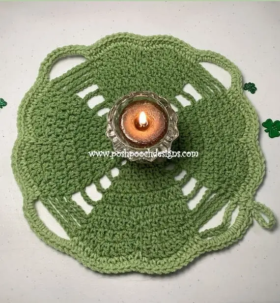 A charming table accent, this crochet doily is shaped like a four-leaf clover. Each leaf is split by delicate lace lines that give the piece a graceful, airy texture. It’s both lucky and lovely – a sweet way to bring handmade detail into your home dining or coffee table decor. PHOTOS by Sara Sach / Ravelry.com Find the original pattern on poshpoochdesignsdogclothes.blogspot.com, or read more