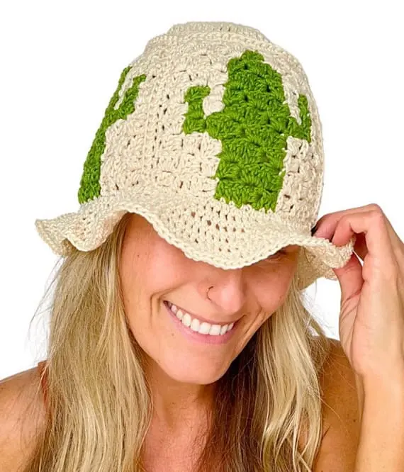 Looking for a hat with character? This cactus-themed crochet bucket hat is a showstopper. Made from bold granny squares featuring tiny crocheted cacti, it’s playful and unique. The soft brim frames the face beautifully while adding a fun twist to your look – cute, quirky, and oh so fun to make. PHOTOS by Melissa Hassler / Ravelry.com Find the original pattern on lovableloops.com, or read more