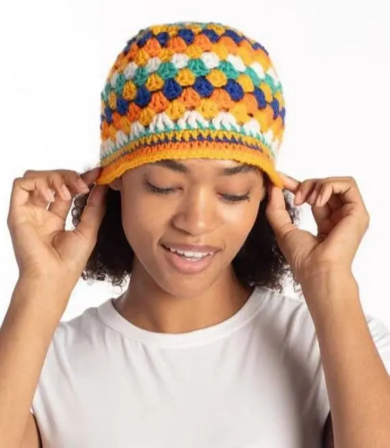 Here’s another fun project to add some flair to your wardrobe. This playful design is perfect for a casual day out or a picnic in the park. With its variety of colors, it’s a cheerful accessory that’s sure to brighten your look. Crocheting this hat will be a delightful way to spend your afternoon, so save the pattern! PHOTOS by Yarnspirations / yarnspirations.com Find the original free pattern on