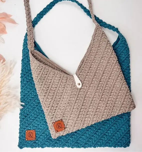 This crochet shoulder bag surprises with its shape. It looks like a flat rectangle but the top has a soft V-cut. The strap is a single elegant braid and the body is made of diagonal cables that look like woven stalks. The flap closes with a little button loop. It is subtle and minimal but the details make it truly one of a kind. PHOTOS by Briana K Designs / Ravelry.com Find the original pattern