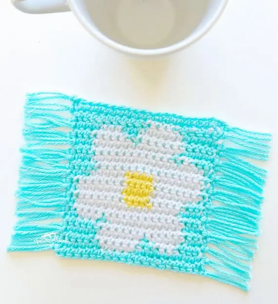 Add a touch of handmade joy to your table with this square crochet coaster. Its centerpiece features a white daisy with a cheerful yellow center, while the fringed edges give it a soft, rustic flair. Perfect for spring gatherings or morning coffee – simple, bright, and full of heart. PHOTOS by Melissa Hassler / Ravelry.com Find the original pattern on lovableloops.com, or read more about it on