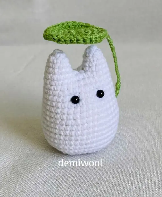 Wearing a tiny green leaf on its head, this white crochet tiny Totoro seems to be waiting for the first drop of rain. Its small size and rabbit-like features give it a light, dreamy vibe. Simple, cute, and quietly mysterious – it feels like a secret forest spirit paused just for a moment. PHOTOS by Demi Tran / Ravelry.com Find the original pattern on Ravelry.