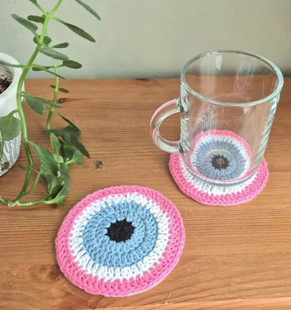 Not your usual crochet coaster – this one sees you. Designed as a large cartoon eye, it starts with pink edges, goes through a white zone, then ends in a blue iris and black pupil. A bold, quirky accent for your table that adds humor to every drink you serve. PHOTOS by Crochela Art / Ravelry.com Find the original pattern on Ravelry.