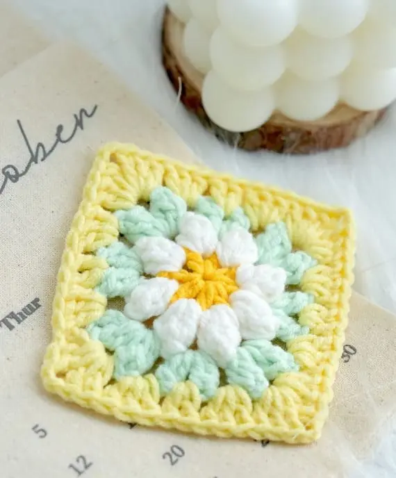Imagine a crochet square that stands out due to its bold and fluffy texture. The soft, thick yarn adds a puffed-up effect to the center flower, creating an eye-catching contrast. With white petals, green leaves, and a vibrant yellow border, this square is perfect for adding an elegant and cozy touch to any project. PHOTOS by Loopara Crochet / Ravelry.com Find the original pattern on loopara.com,