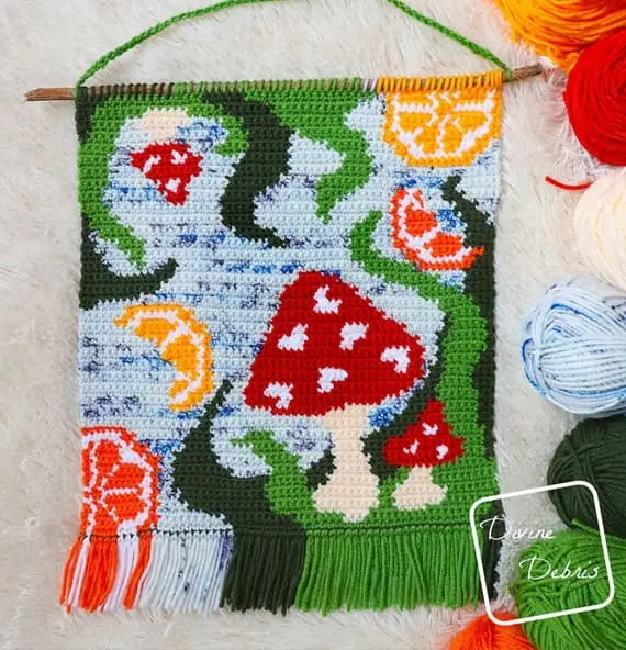Add a woodland vibe to your home with this crochet wall hanging. Featuring mushrooms, oranges, and forest motifs, it brings a natural charm to your space. A short fringe at the bottom adds texture and movement to this cozy and stylish decoration. PHOTOS by Divine Debris / Ravelry.com Find the original pattern on divinedebris.com, or read more about it on Ravelry.