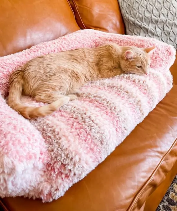 A cozy crochet cat couch designed just for your cat! Made with plush yarn in a beautiful shade of pink, this crochet mini sofa provides the ultimate lounging spot for your feline friend. The soft, cushioned structure makes it inviting, while the stylish design blends seamlessly into any home. Whether your cat loves to nap or simply lounge like royalty, this handmade cat couch will be their new