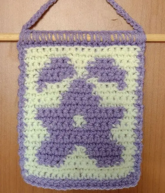 This soft lilac crochet wall hanging on a white background features a lovely flower with delicate petals. It’s a subtle and graceful accent piece for your wall that brings calm, warmth, and a modern handmade touch to your interior with gentle crochet charm. PHOTOS by Sofia Bertozzi / Ravelry.com Find the original pattern on Ravelry.