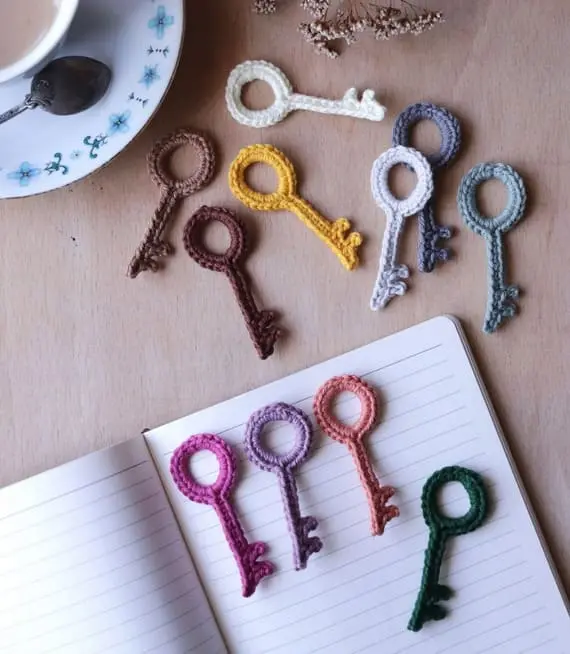 Imagine a cardigan sprinkled with tiny crochet keys each one hinting at secrets, stories, or forgotten doors. This key-shaped applique has a unique silhouette that instantly catches the eye. It’s charming, a little mysterious, and absolutely perfect for those who love original details.