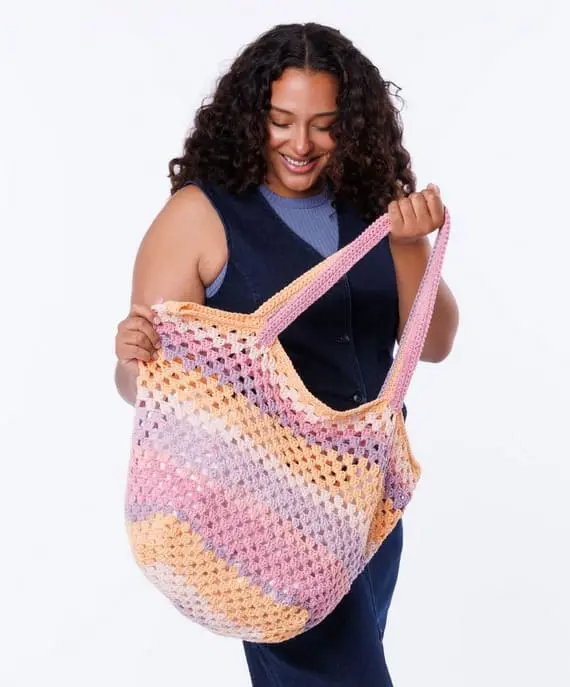 This classic tote-style crochet bag combines structure and softness in the best way. Made with sturdy short handles and worked entirely in granny stitch, it features gentle pastel stripes in lilac, lavender, soft pink, and a warm orange-yellow blend. The color transitions create a subtle gradient effect, making it a stylish yet practical everyday accessory with a retro soul.