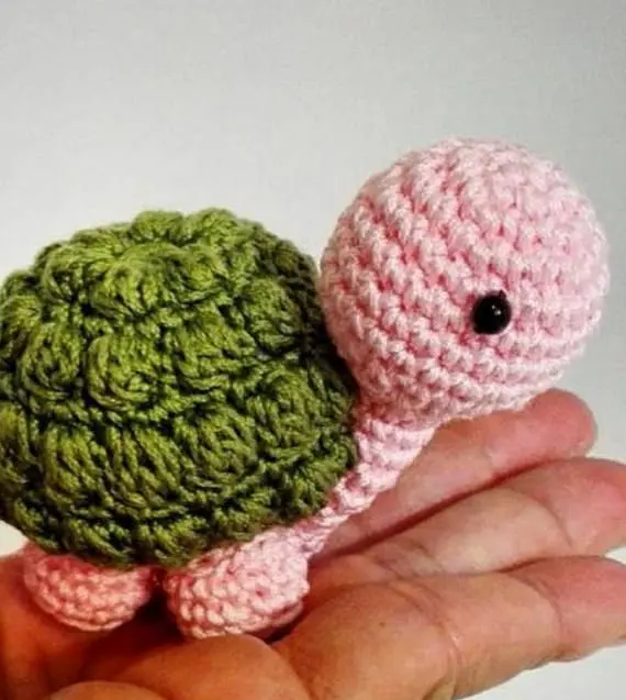 One more amigurumi-inspired project that will surely melt your heart! This adorable turtle has a green puffy shell and a pink round head with tiny eyes. The colors look great together! Find out how to crochet turtle little Bobby by the link below the photo. PHOTOS by Amicidicotone / amicidicotone.blogpost.com Find the original free pattern on amicidicotone.blogpost.com.