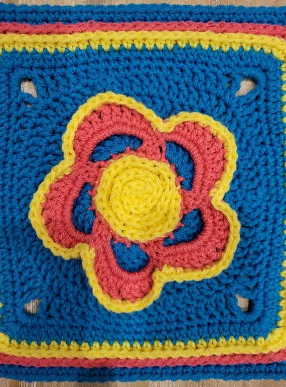 Vibrant and dynamic, this crochet square packs a punch with its lively color combinations. The deep blue base is contrasted by bright yellow and red stripes, drawing attention to the bold floral applique at the center. Grab your yarn, hook, and follow the free square pattern to bring this cheerful square to life. PHOTOS by Lindsey Stephens / Ravelry.com Find the original pattern on