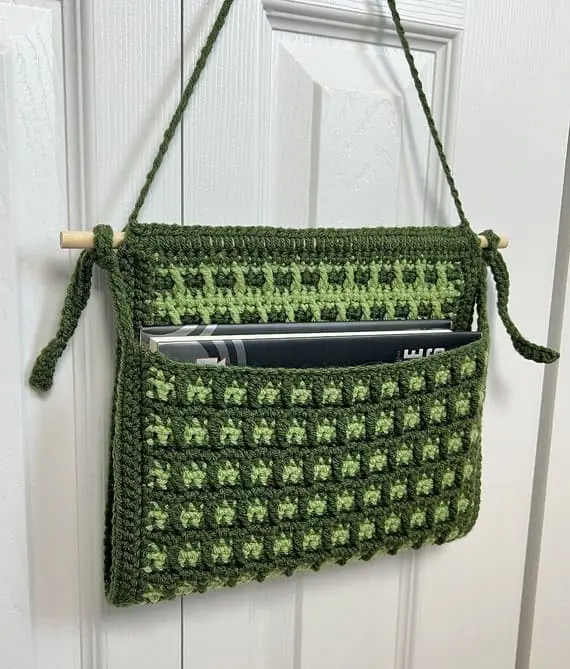 Functional meets handmade charm in this crochet wall hanging with pockets. Designed to hold a book, journal, or other small items, it adds warmth and personality to your space. Hang it near your bed, desk, or reading nook to keep essentials within reach and in style. PHOTOS by Lolla Nanni / Ravelry.com Find the original pattern on Ravelry.
