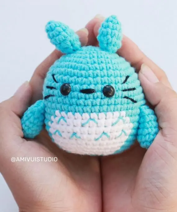 This tiny turquoise crochet Totoro is full of playful charm. Its plump shape and wide-eyed look make it instantly likable, as if it’s mid-laugh or ready for mischief. Perfectly palm-sized, it works as a small plushie, a pocket guardian, or a joyful pop of color on your workspace or bag. PHOTOS by Ami Ami / Ravelry.com Find the original pattern on amivuistudio.com, or read more about it on Ravelry.