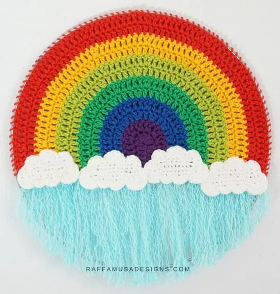 Introduce a burst of color to your space with this crochet rainbow wall hanging, featuring soft clouds and gentle raindrops. A fun, vibrant addition to any room, it brings an airy, whimsical vibe. Its lively colors contrast beautifully with the fluffy clouds, creating a joyful and calming atmosphere. PHOTOS by Raffaella Tassoni / Ravelry.com Find the original pattern on raffamusadesigns.com, or