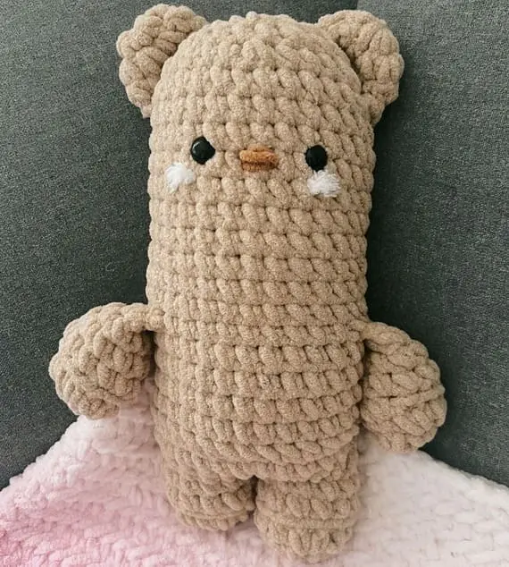 Sometimes a toy is so soft and cuddly that it makes you smile just by looking at it. This simple crochet pattern helps you make an oversized, chunky crochet teddy bear that is equal parts plush toy and pillow. Its long body and soft texture make it feel like a giant marshmallow with ears. Fun, whimsical, and incredibly huggable. PHOTOS by Hooked on Alice / Ravelry.com Find the original pattern on