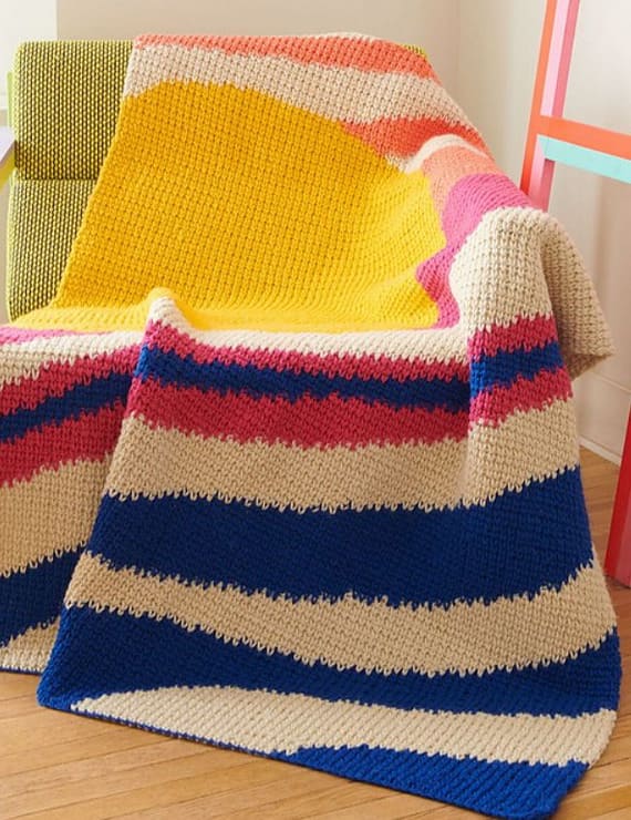 This intarsia blanket endows me with the bright energy of sunrise! All I want is to teleport to that picture and sit on the beach, getting the vibes of this beautiful natural phenomenon. The blanket crochet pattern is free and worked with an easy half-double crochet stitch. It is reversible! Find the original free pattern on yarnspirations.com, or read more about it on Ravelry.