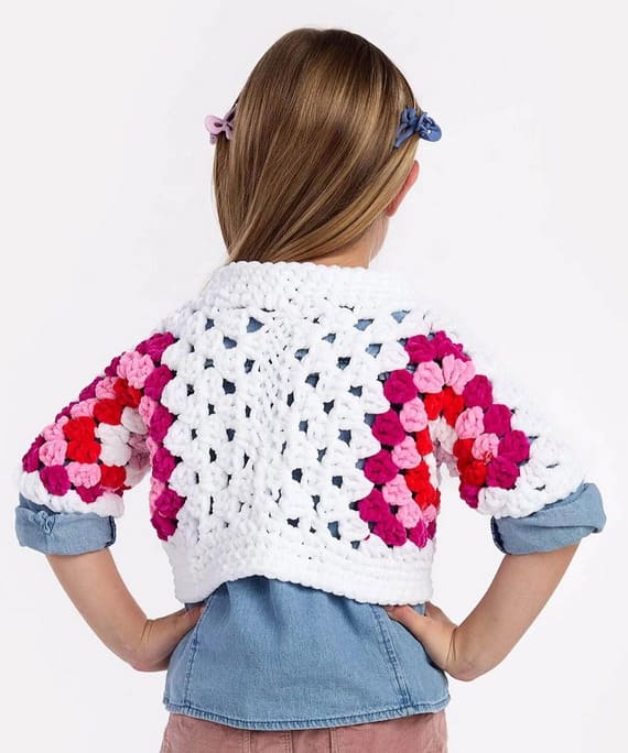 This children’s crochet cardigan brings a playful elegance to handmade wear. Built from hexagon elements with a bright granny square core and a clean white base, it’s cropped for comfort and movement. Layer it over dresses or tees for a fresh look that works in all seasons. Find the original pattern on premieryarns.com, or read more about it on Ravelry.