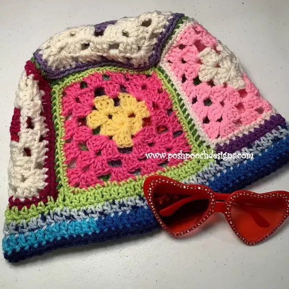 A colorful crochet bucket hat made from granny squares, each featuring a heart at the center. Bright, playful, and full of personality, it’s a statement piece for festivals, sunny strolls, or days when you want to turn heads. Handmade fashion has never looked so bold. Express your mood and style with every stitch – a joyful burst of color and fun. PHOTOS by Sara Sach / Ravelry.com Find the