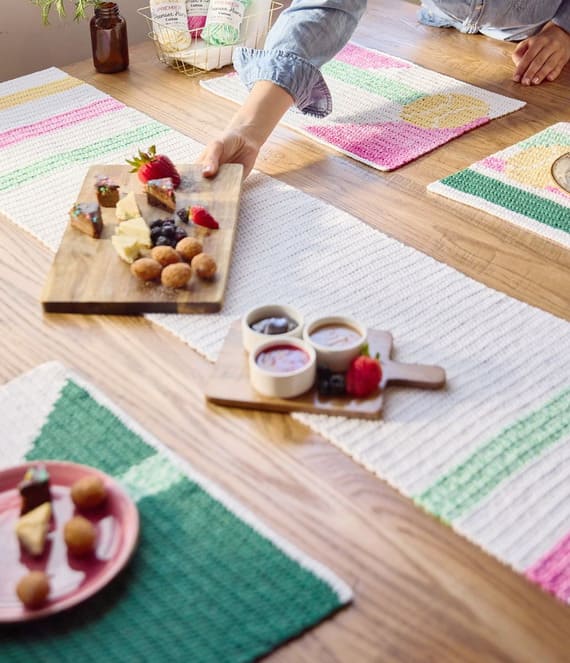 Elevate your table setting with a coordinated set of crochet table runners. A long centerpiece runner pairs beautifully with smaller individual placemats, offering both style and function. Mixing different stripe patterns and colors allows you to create a unique, personalized look for any gathering. Handmade charm meets modern table decor in this creative project. PHOTOS by Liz Salazar /