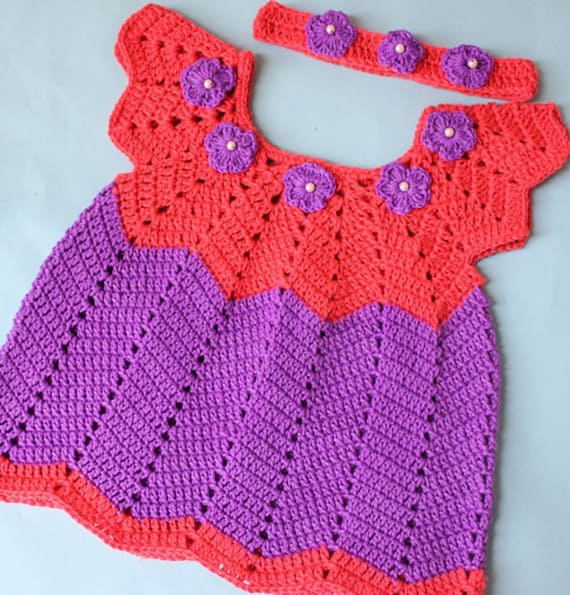 This crochet baby dress is a real stunner with ripple stripes in rich shades of red and purple. Floral appliques add charm to the neckline, and the triangle edging on the sleeves and hem enhances the playful shape. The clever mix of texture and color makes it a unique and eye-catching piece for any special little fashionista. Find the original pattern on crochetcrosiahome.blogspot.com, or read