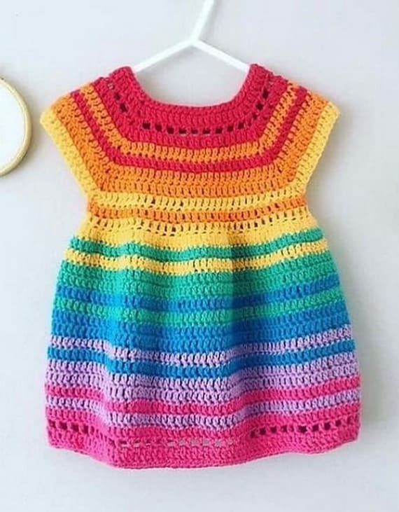 Every little girl loves colorful baby clothes, especially dresses! So create this lovely rainbow toddler dress for your child or as a gift. You won’t find such a beautiful dress in any shop, so start today! I’m sure every baby girl will love it. Find the original free pattern on Ravelry.