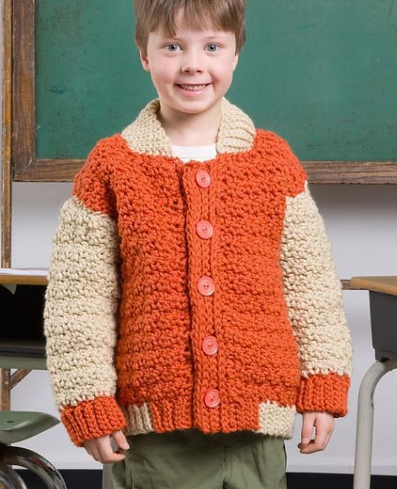 This cozy and vibrant crochet kids’ cardigan is made from bulky yarn, making it the perfect choice for colder days. Its thick texture and front button closure add both style and practicality. You can customize it with different color combinations, making it a standout piece in any wardrobe. Find the original free pattern on yarnspirations.com, or read more about it on Ravelry.
