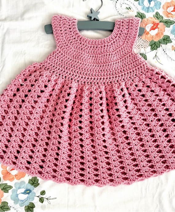 This adorable crochet baby dress is a crochet dream! The top is worked in a timeless round-yoke style with a small button closure on the back, making it easy to wear. The skirt flows into a lace design with gentle ruffles that add charm and texture. It’s a perfect piece for warm days, baby photos, or special handmade gifts. PHOTOS by Frisian Knitting / Ravelry.com Find the original pattern on
