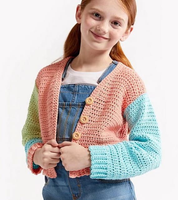 This crochet children’s cardigan combines a simple construction with a great color choice. The design is characterized by a combination of soft pastel colors. Plus, the cropped fit makes it more comfortable to wear and great for warmer seasons. This children crochet cardigan pattern is free. PHOTOS by Premier Yarns Design Team / Ravelry.com Find the original free pattern on premieryarns.com, or