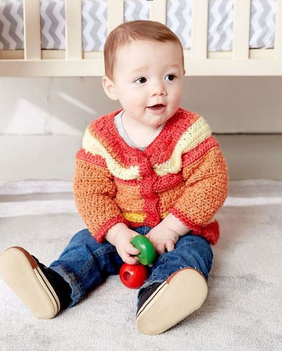 A cheerful crochet cardigan for little ones. This stunning piece is what your baby needs to feel comfortable. The cardi construction suits active babies, so it’s sure to become your baby’s favorite garment. With the step-by-step crochet pattern you will complete this cardigan in no time. Find the original free pattern on yarnspirations.com, or read more about it on Ravelry.