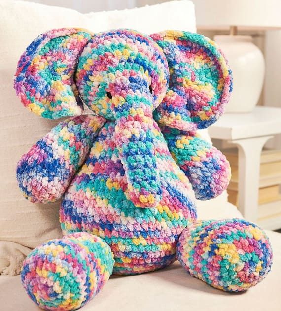 Made with plush, super bulky yarn, this large crochet elephant is a cuddle magnet! Its long trunk, floppy ears, and soft body make it perfect for nurseries or cozy corners. Using this easy crochet pattern, you’ll find easy steps for shaping and finishing – fun to make and even better to hug. PHOTOS by Erin Fisher (On Fisher’s Hook) / Ravelry.com Find the original pattern on premieryarns.com, or