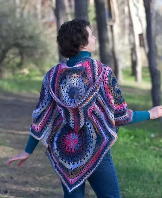 Discover the serenity and style of the Aura Vibes Poncho, a free crochet pattern that brings a touch of mandala-inspired calm to your wardrobe! Comprising just five thoughtfully designed squares, this poncho is as soothing to crochet as it is beautiful to wear. The pattern begins at the center of each square and radiates outward, creating gentle, mesmerizing motifs that echo the peace of a