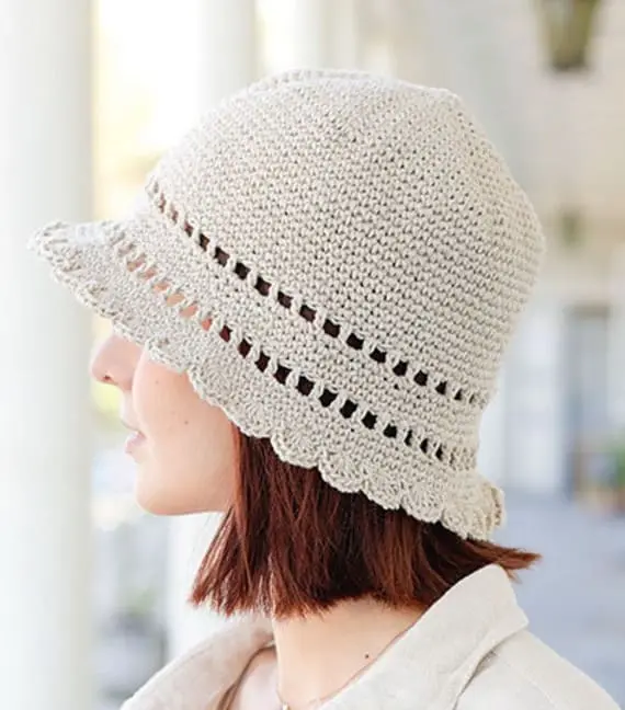 This crochet bucket hat is a timeless summer staple. Made in a soft light yarn using classic stitches, it features two delicate mesh rows near the brim for breathability and texture. The edge is finished with sweet scalloped details, adding a playful, feminine touch to this sun-ready accessory. PHOTOS by DROPS design / Ravelry.com Find the original pattern on garnstudio.com, or read more about it